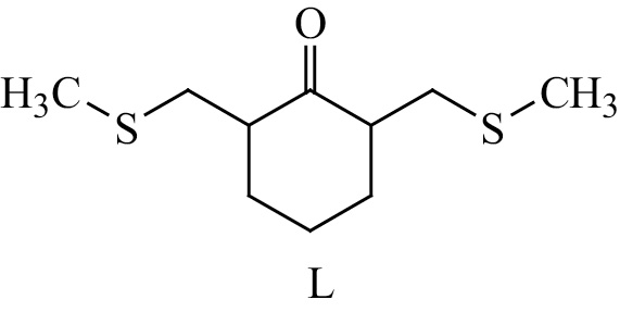 2,6-Бис[(метилсульфанил)метил]циклогексан-1-он (далее реагент L, схема 1) хорошо растворим в ацетоне, этаноле, хлороформе, гексане, толуоле, о- и п-ксилоле. Растворимость его в воде при 20°С составляет ~0.51 г/л (0.0023 моль/л) и сопоставима с растворимостью таких нейтральных промышленных экстрагентов, как трибутилфосфат (0.4 г/л) и диизобутилкетон (~0.6 г/л) [17]. Для экстракции Pd(II) из растворов хлористоводородной кислоты подходящим разбавителем реагента L, при использовании которого не образуется третьей фазы, является хлороформ.