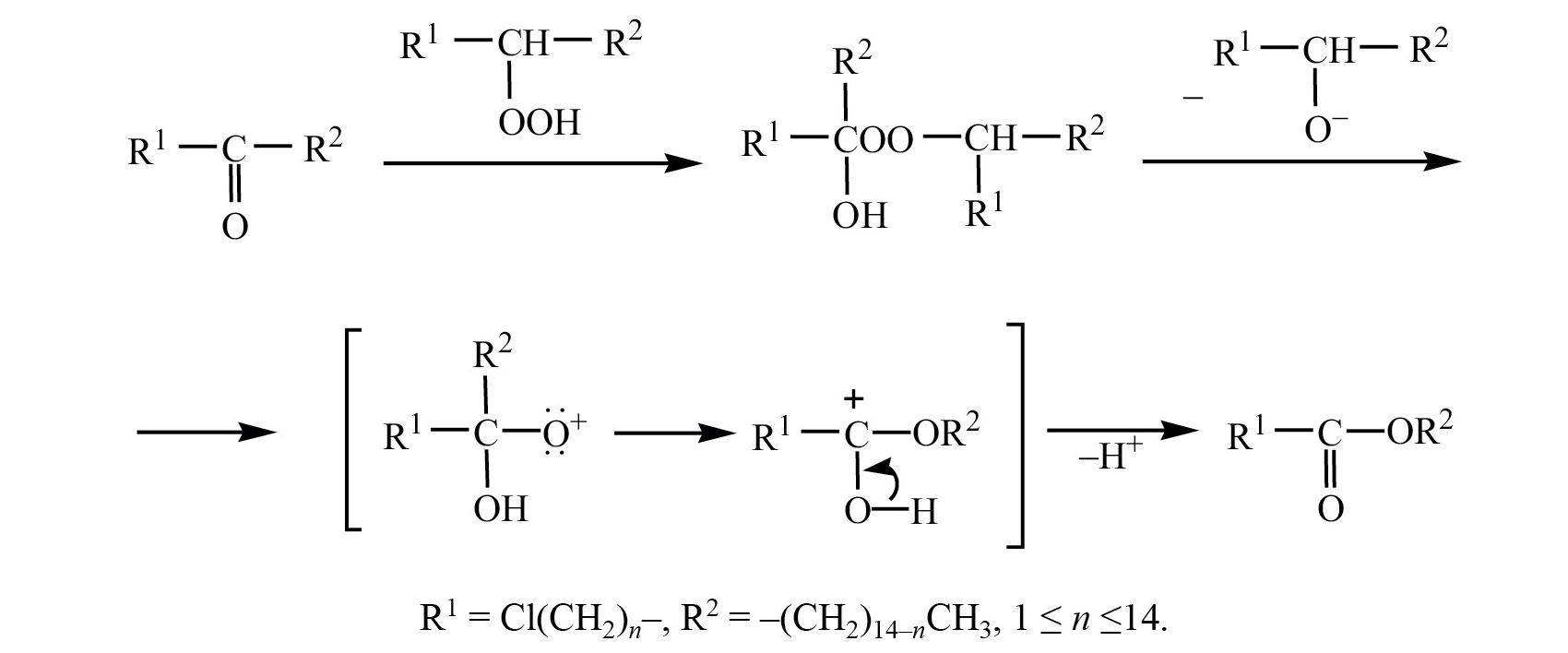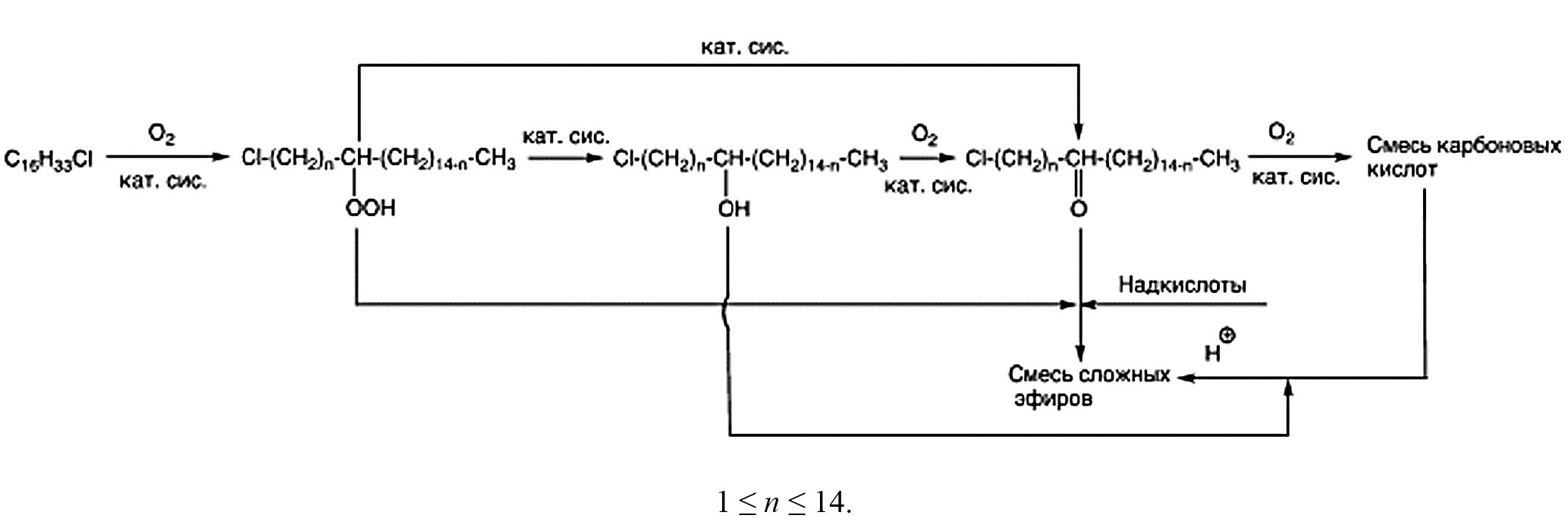 Согласно приведенной схеме, образование сложных эфиров в условиях жидкофазного процесса окисления 1-хлоргексадекана кислородом воздуха в указанных условиях принципиально может быть результатом трех реакций: реакции этерификации между образующимися кислотами и спиртами, реакций взаимодействия образующихся кетонов с гидропероксидами или надкислотами (реакция Байера–Виллигера).