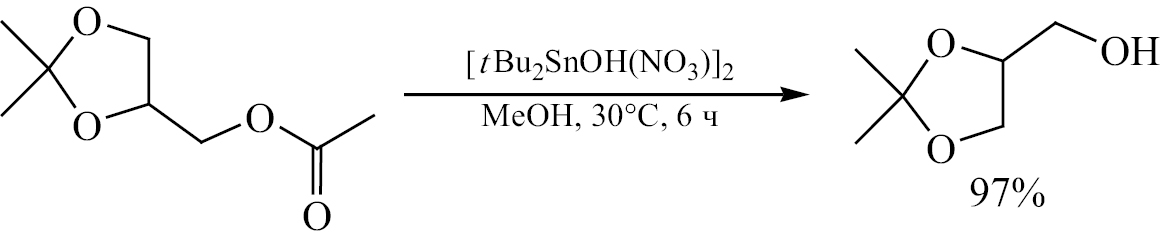 Омылением (2,2-диметил-1,3-диоксан-4-ил)метилацетата в присутствии оловоорганического реагента (схема 5) получают 2,2-диметил-4-оксиметил-1,3-диоксолан с выходом 97% [50]. В качестве растворителя используется метанол. Реакция протекает в течение 6 ч при температуре 30°C.