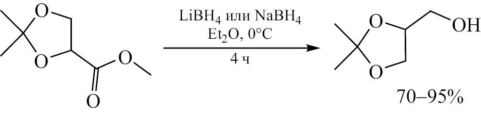 При восстановлении 2,2-диметил-1,3-диоксолан-4-карбоксилата гидридами металлов [46, 53–56] также получают 2,2-диметил-4-оксиметил-1,3-диоксолан (схема 8). Лучшие результаты достигаются при 0°C за 4 ч в среде диэтилового эфира, выход составляет 70–95%.