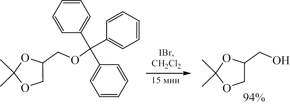Эффективный метод расщепления тритилового эфира под действием монобромида иода предложен в работах [57, 58] (схема 9). В качестве катализатора используется интергалид IBr в среде хлористого метилена, реакция протекает за 15 мин при комнатной температуре с образованием 2,2-диметил-4-оксиметил-1,3-диоксолана выходом 94%.