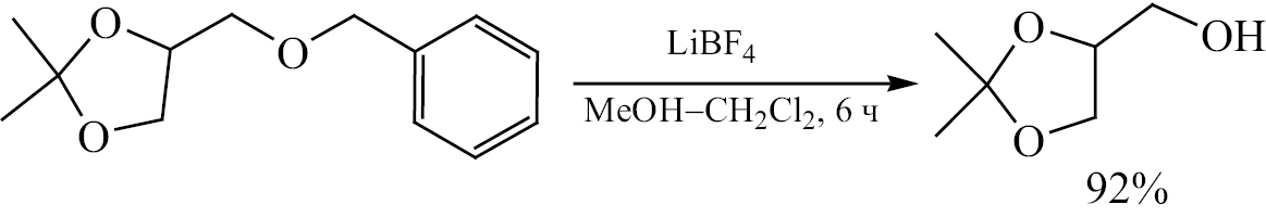 Разрушение бензилового эфира 2,2-диметил-4-оксиметил-1,3-диоксолана тетрафторборатом лития также приводит к образованию 2,2-диметил-4-оксиметил-1,3-диоксолана с выходом 92% (схема 10). Реакцию проводят в течение 6 ч в смеси метанол–хлористый метилен.