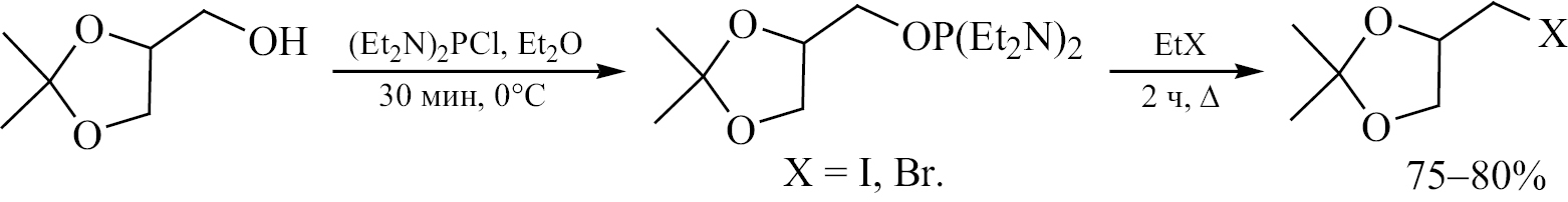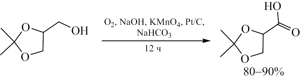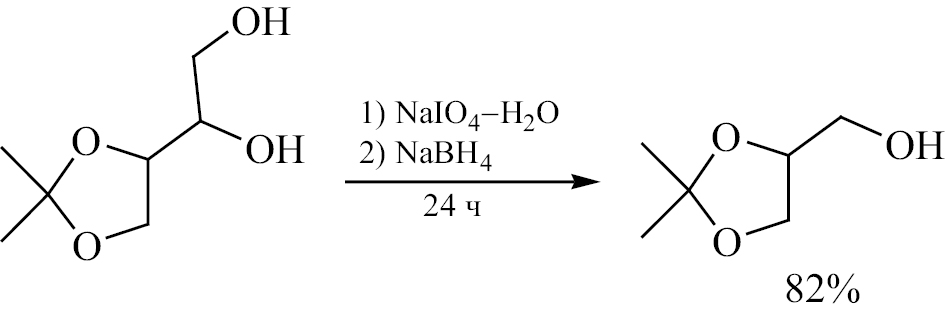 Окислительное расщепление 1,2:5,6-бис-О-(1-метилэтилиден)-D-маннитола периодатом натрия и последующее восстановление промежуточного альдегида боргидридом натрия приводят к образованию 2,2-диметил-4-оксиметил-1,3-диоксолана с выходом 63–80% (схема 17) [68, 69].
