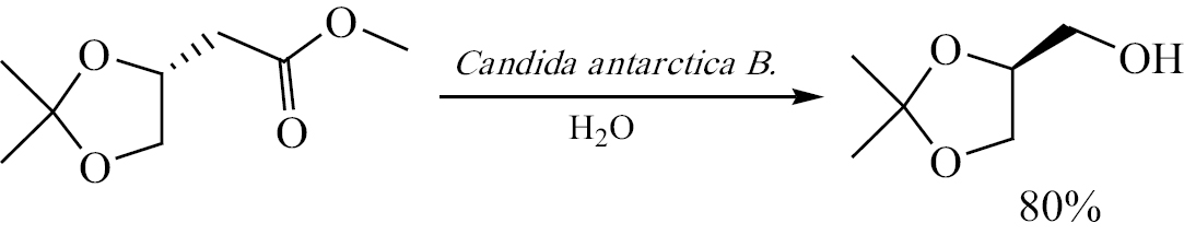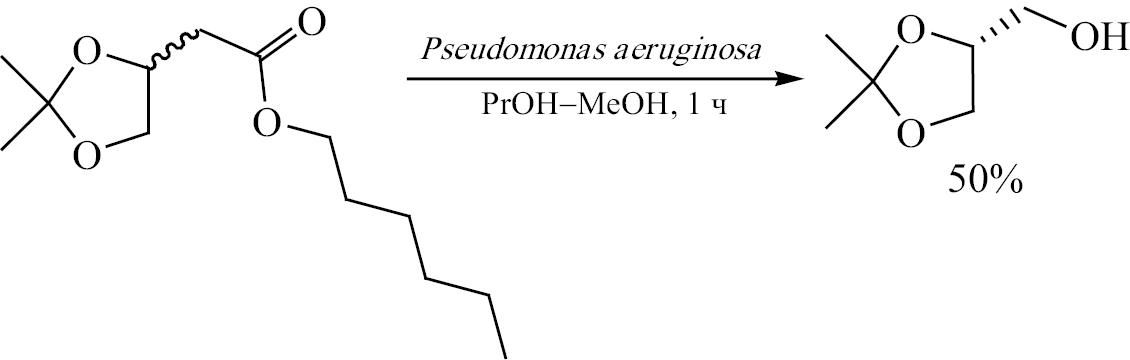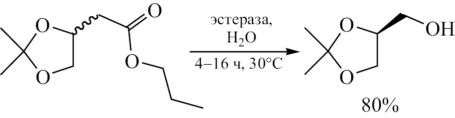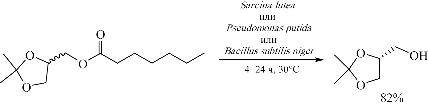 Описано использование грамотрицательных бактерий Comamonas testosteroni для получения (S)-энантиомера 2,2-диметил-4-оксиметил-1,3-диоксолана c выходом 60–65% (схема 25) [88]. Энантиомерная чистота S-2,2-диметил-4-оксиметил-1,3-диоксолана зависимости от используемого спирта и времени выдерживания реакции составляет от 72 до 94%.