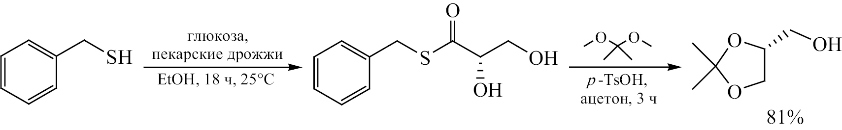 При инкубации бензилмеркаптана в присутствии глюкозы образуется S-бензилтиоглицерат [90, 91], который превращается в S-2,2-диметил-4-оксиметил-1,3-диоксолана с оптической чистотой ее ~ 98% (схема 27). Получение S-энантиомера 2,2-диметил-4-оксиметил-1,3-диоксолана осуществляется в присутствии 2,2-диметоксипропана и п-толуолсульфокислоты в растворе ацетона.