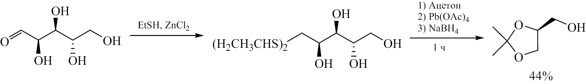 R-Энантиомер 2,2-диметил-4-оксиметил-1,3-диоксолана получен из L-арабинозы (схема 32) с высокой энантиоселективной чистотой (80%) и выходом 44%.
