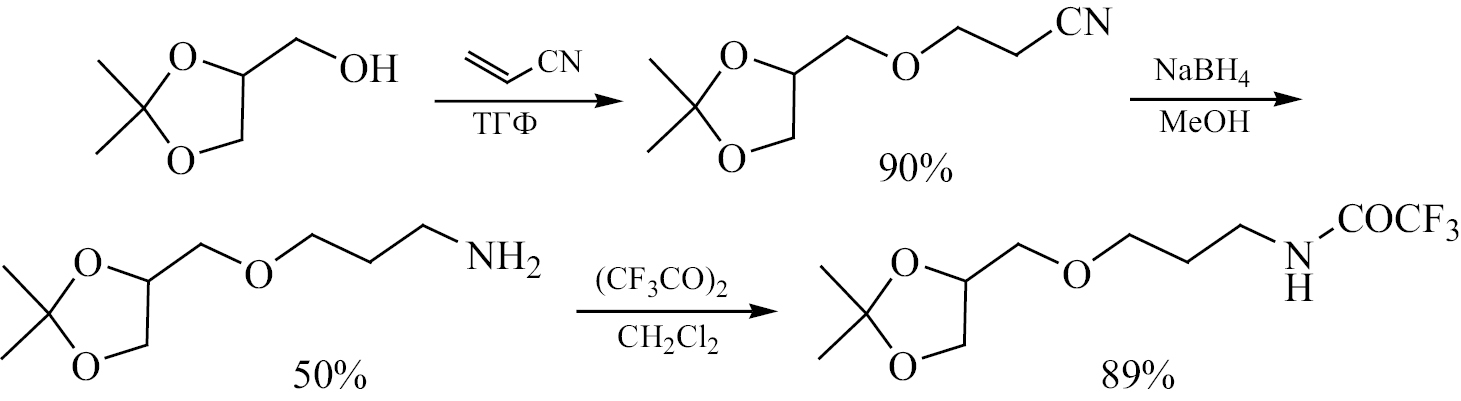 Количественный синтез 2,2-диметил-4-оксиметил-1,3-диоксолана реакцией глицеральдегида с ацетоном [41–47] включает восстановление боргидридом натрия промежуточного гетероциклического альдегида без его выделения (схема 3).