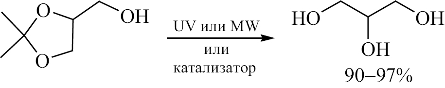 Замена ацетона на 2,2-диметоксипропан [36–40] позволяет провести реакцию более селективно, поскольку кеталь выступает в качестве поглотителя воды (схема 2). В качестве катализаторов используются п-толуолсульфокислота или соли металлов. Выходы 2,2-диметил-4-оксиметил-1,3-диоксолана достигают 89–92%.
