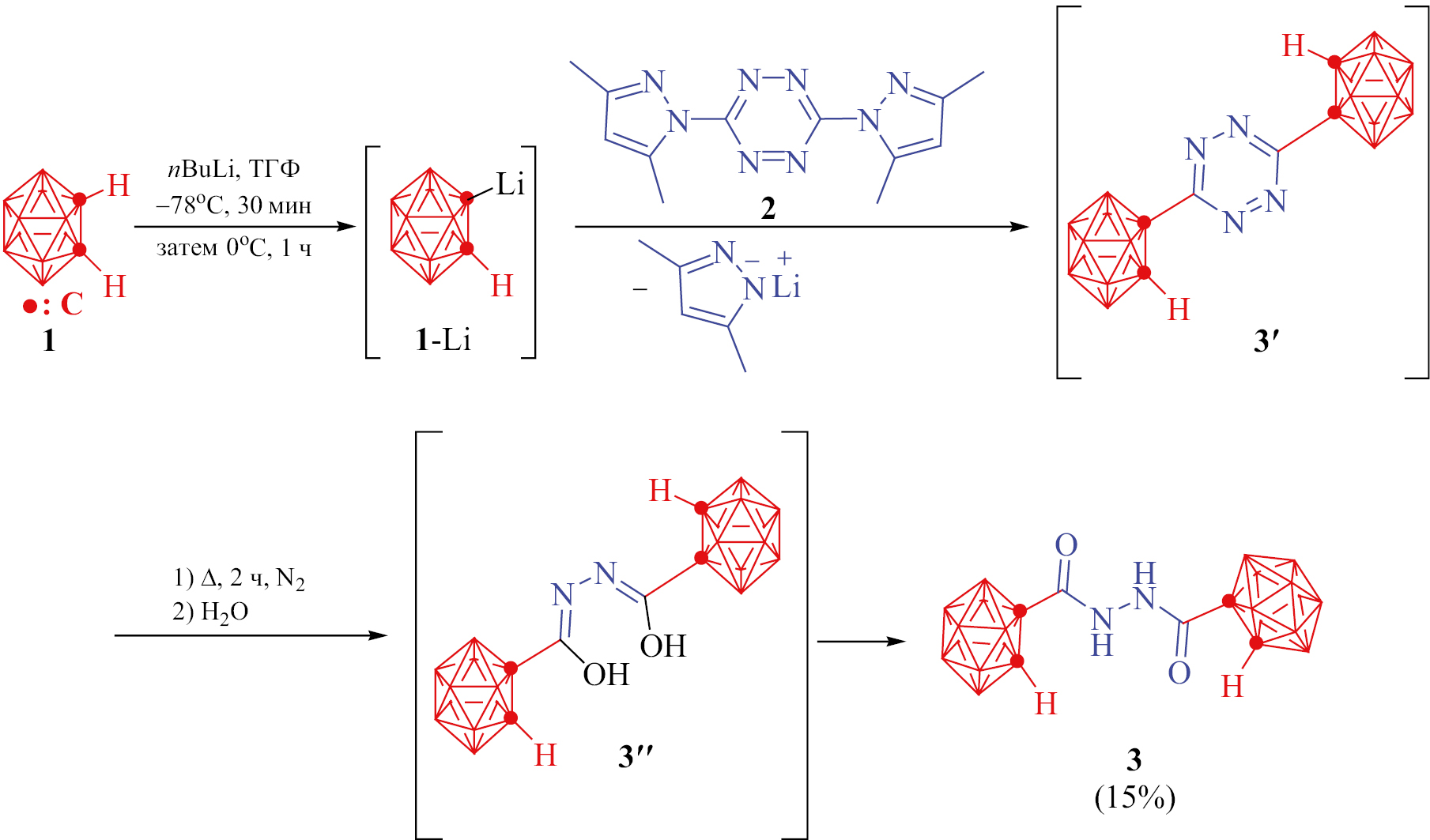 орто-Карбораниллитий 1-Li генерировали из орто-карборана 1 путем прибавления n-BuLi в течение получаса в абсолютированном ТГФ при –78°С в атмосфере аргона, затем полученный раствор добавляли к раствору тетразина 2 при 0°С, реакционную смесь выдерживали еще 1 ч при данной температуре. Стоит отметить, что в этих условиях, согласно данным ТСХ, протекания реакции не наблюдалось, тогда как при нагревании реакционной массы до кипения с последующим выдерживанием в течение 2 ч происходило снижение содержания вышеупомянутого азагетероцикла и фиксировалось образование нового продукта. Превращение сопровождалось существенным осмолением реакционной массы, тем не менее, с помощью колоночной хроматографии полученный продукт был выделен в индивидуальном виде с выходом 15% (схема 1).