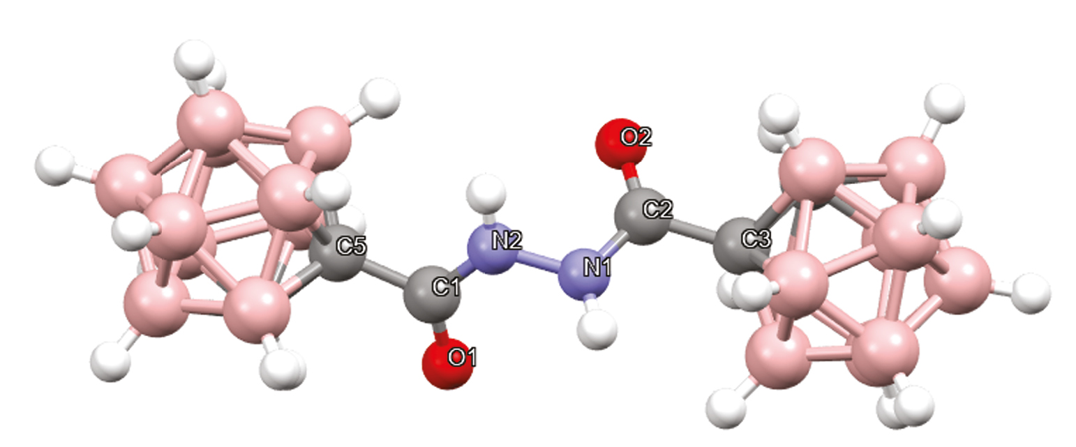 С целью установления структуры продукта реакции нами использованы методы спектроскопии ЯМР 1Н, масс-спектрометрии, а также элементный анализ. Так, в спектре ЯМР 1Н отсутствовали сигналы протонов фрагментов 3,5-диметил-1H-пиразола (DMP). Предположение, что выделенное соединение является продуктом дизамещения остатков DMP на фрагменты карборана, не подтверждалось, так как помимо ожидаемых в этом случае сигналов протонов карборана [синглет в области 3.55 м. д. (СН-протон, а также уширенный синглет в диапазоне 2.62–1.78 м. д. (BH-протоны)] присутствовал синглет в области 5.89 м. д. при соотношении интегральных интенсивностей данных сигналов 1:10:1 соответственно. Также на основании данных масс-спектрометрии фиксировался пик молекулярного иона со значением m/z 373 вместо 376, который должен иметь место в случае продукта дизамещения. Таким образом, очевидным стал факт модификации/трансформации 1,2,4,5-тетразинового кольца в ходе реакции. Обнаруженное химическое превращение может быть отнесено к синтетической стратегии «от сложного к простому» (деструктивная химия), которая позволяет получать структуры, которые чрезвычайно трудно или практически невозможно получить классическими химическими методами [24, 25]. При использовании рентгеноструктурного анализа удалось установить структуру продукта реакции как бис(орто-карборанил)диформилгидразида 3 (рис. 1).