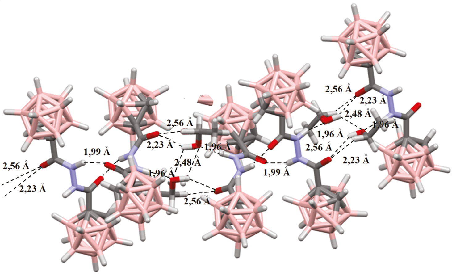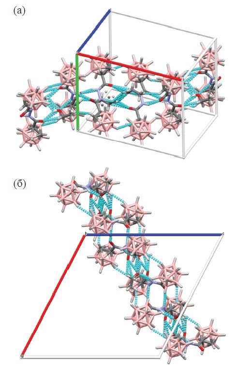 Кроме того, взаимное расположение молекул в кристалле относительно друг друга определяется расстояниями В–Н···В в пределах 3.12–3.20 Å, немного превышающих сумму ван-дер-вальсовых радиусов данных атомов.