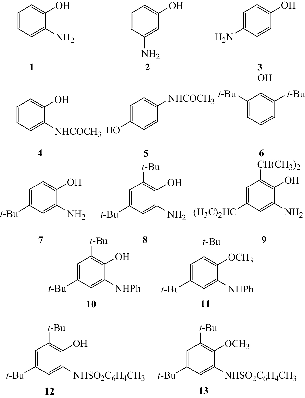 На схеме 2 представлены структурные формулы исследованных функционализированных фенолов. Выбор производных 2-аминофенола обусловлен тем, что ранее в наших исследованиях установлена их противовирусная и антиоксидантная активность [39–41, 51]. Аминофенол 10 является активным действующим началом противогерпетического препарата Бутаминофен, выпускаемого РУП «Белмедпрепараты».