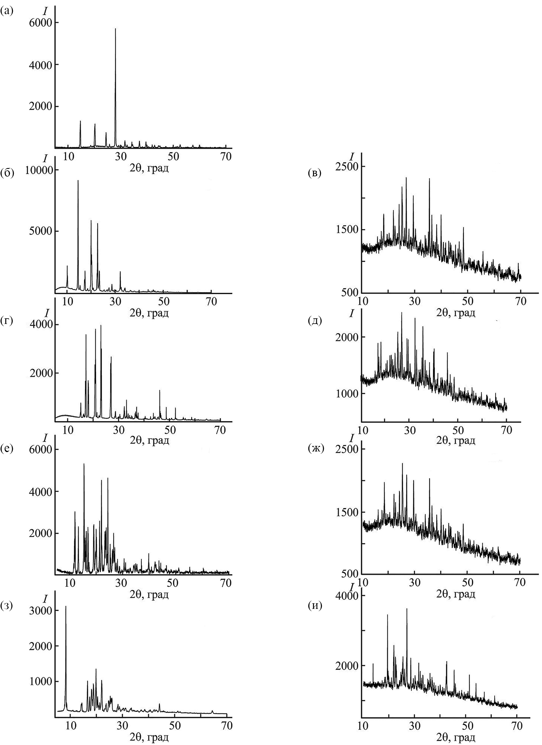 Рис. 1. Порошковые дифрактограммы pyca (а), phen (б), Eu(pyca)3phen∙H2O (в), dipy (г), Eu(pyca)3(dipy)2(H2O)2 (д), tppo (е), Eu(pyca)3tppo∙H2O (ж), dphg (з), Eu(pyca)3(dphg)2(H2O)2 (и)