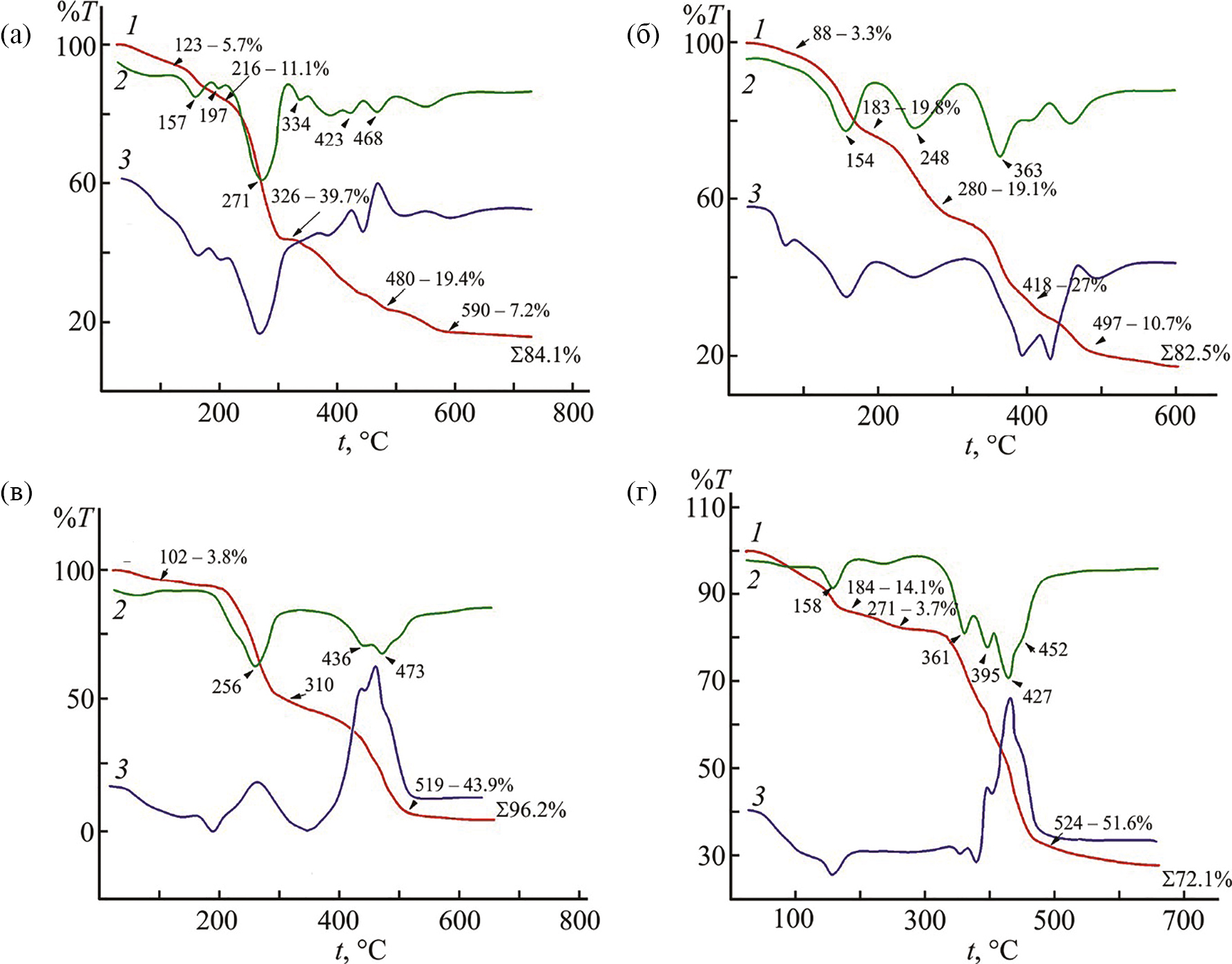 Рис. 3. Термограммы пиразинатов европия(III): Eu(pyca)3(H2O)2 (а), Eu(pyca)3(dipy)2(H2O)2 (б), Eu(pyca)3(dphg)2(H2O)2 (в), Eu(pyca)3tppo∙H2O (г)