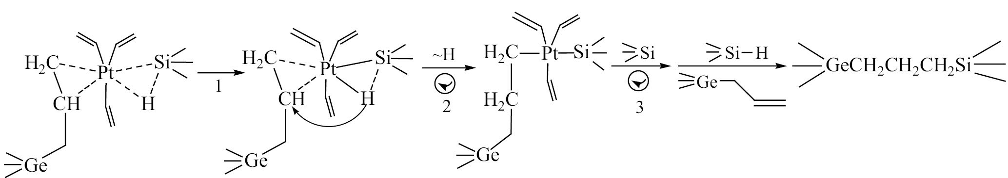 На первой стадии происходит образование π-комплекса и активация гидросилана. Многочисленные опыты [1–3] подтвердили образование только γ-аддуктов, это позволяет предположить, что независимо от природы заместителей у атома германия (Cl, Me) имеет место преимущественная координация атома металла с γ-углеродным атомом олефина, на котором, по-видимому, сосредоточена максимальная электронная плотность. На следующем этапе на каталитическом центре происходит взаимодействие активированного гидросилана с координированным олефином, при этом атом водорода присоединяется к β-атому углерода (2→3). Этот процесс будет проходить тем легче, чем больше дефицит электронной плотности на β-атоме углерода и степень гидридности атома водорода гидросилана.