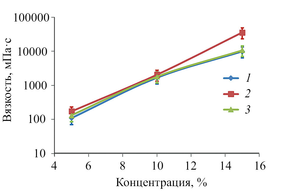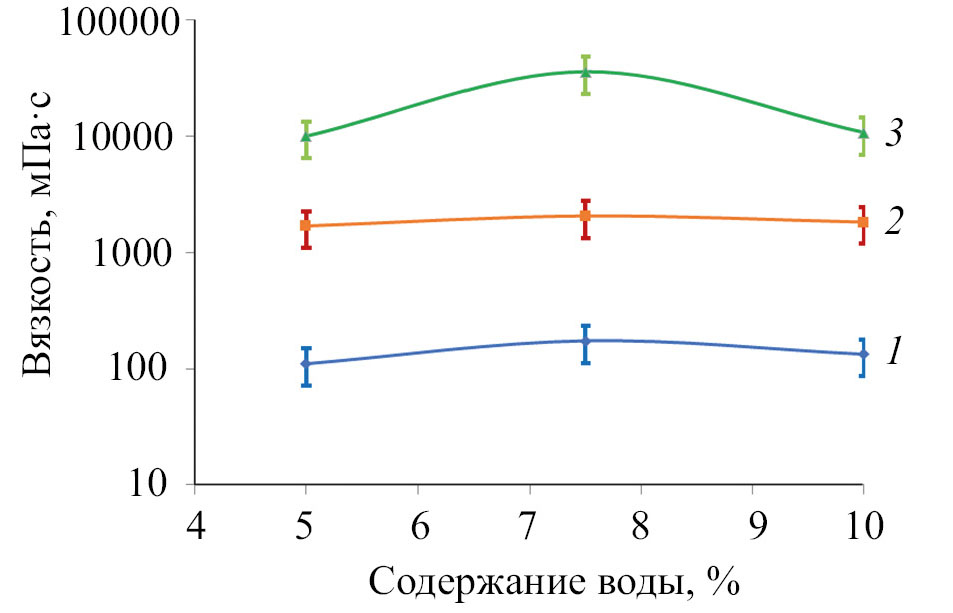 На рис. 1 представлены результаты исследования реологических свойств растворов диацетата целлюлозы с степенью замещения 2.6 и степенью полимеризации 400 в ацетоне с концентрацией 5, 10 и 15% при изменении содержания воды в ацетоне в пределах 5, 7.5 и 10 мас%.
