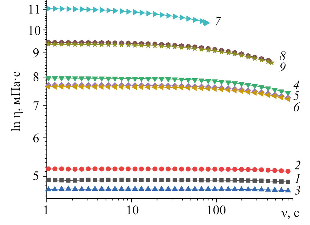 Рис. 3. Реограммы растворов диацетата целлюлозы (ДАЦ) различной концентрации в смеси ацетон–вода при массовых соотношениях: 1 – ДАЦ 5% (90:10), 2 – ДАЦ 5% (92.5:7.5), 3 – ДАЦ 5% (95:5), 4 – ДАЦ 10% (90:10), 5 – ДАЦ 10% (92.5:7.5), 6 – ДАЦ 10% (95:5), 7 – ДАЦ 15% (90:10), 8 – ДАЦ 15% (92.5:7.5), 9 – ДАЦ 15% (95:5).