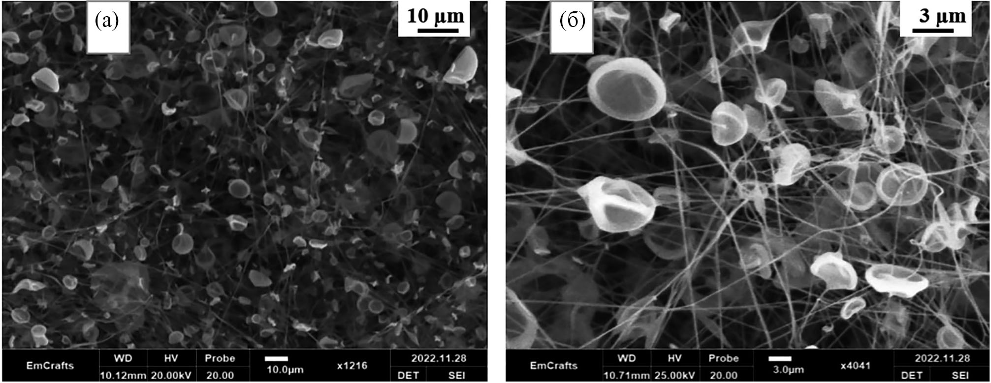 Как видно из рис. 4а, при небольшом увеличении наблюдается наличие узлов и бусинок, которые связаны с условиями электроформования, а также параметрами раствора диацетата целлюлозы. При дальнейшем увеличении видно, что между узлами или бусинками наблюдаются нановолокна с диаметрами в широком диапазоне от 100 до 800 нм (рис. 4б.)