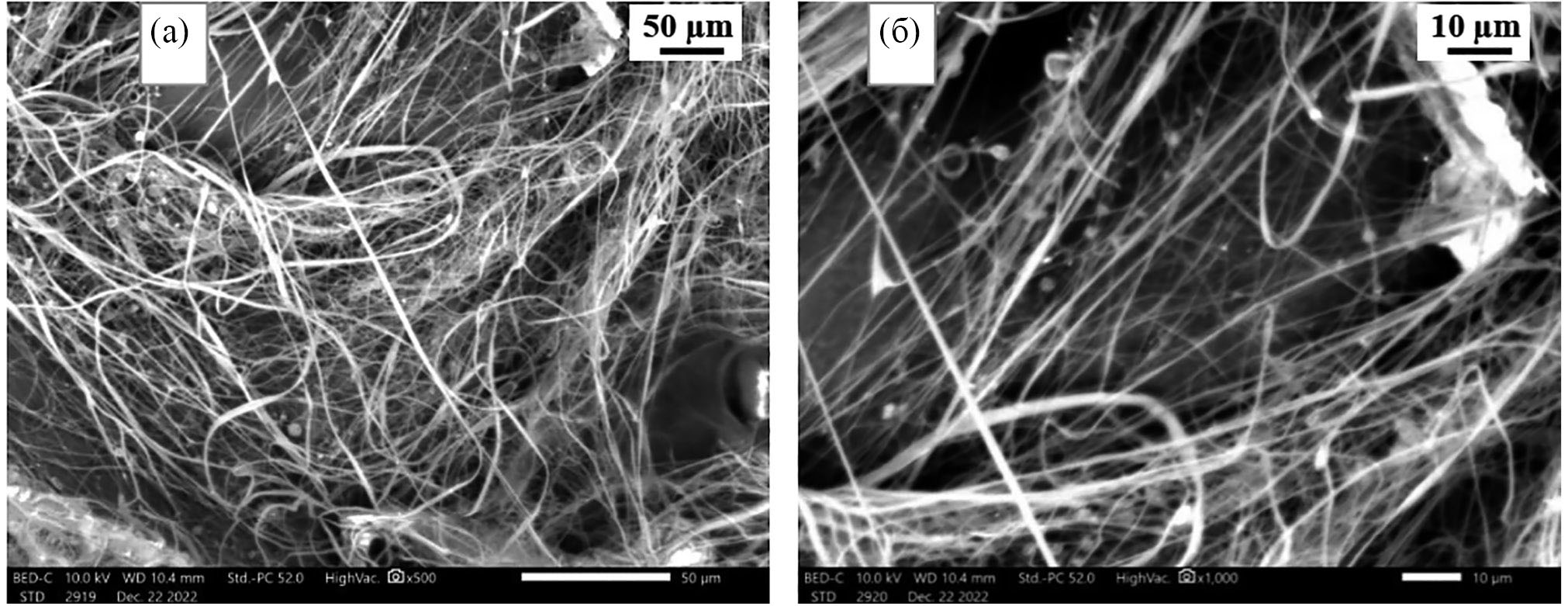 Рис. 5. СЭМ снимки нановолокон, полученных из 10%-ных растворов диацетата целлюлозы при различном увеличении: (а) ×500, (б) ×1000.