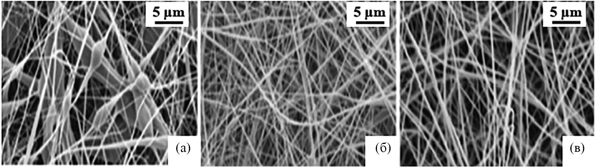 Широкое разнообразие полимеров и растворителей, используемых для электроформования, затрудняет определение золотого стандарта параметров, универсальных для каждого процесса [1]. Основополагающим фактором для получения наноразмерных волокон является напряженность электрического поля в процессе их формования. Для каждого прядильного раствора существует оптимальный диапазон изменения напряженности поля, которое также влияет на диаметр и морфологию волокон за счет воздействия на скорость течения полимерной струи. С увеличением напряженности повышается скорость потока. С ростом скорости потока диаметр и размер нановолокон также увеличиваются. При слишком высоких скоростях потока полимерного раствора волокно не может полностью высохнуть до момента достижения коллектора, что может привести к бисерной морфологии [2, 3]. Появление бисерной морфологии, вызванной вязкоупругими эффектами в недостаточно высохших полимерных струях, возможно и в случае, если расстояние между капилляром и коллектором слишком маленькое [3]. С увеличением расстояния диаметр нановолокна будет уменьшаться, хотя этот эффект, как правило, не является лимитирующим по сравнению с эффектами от изменений других параметров [4].