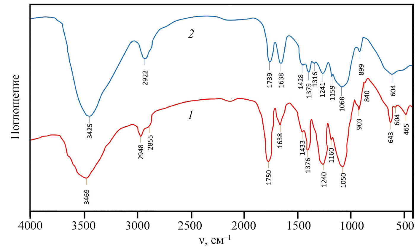 На рис. 7 представлены результаты сравнительных исследований ИК спектров нановолокон диацетата целлюлозы и целлюлозы, полученных путем гидролиза нановолокон диацетата целлюлозы в водном растворе гидроксида калия. В спектрах нановолокон диацетата целлюлозы (рис. 7, кривая 1) наблюдаются интенсивные полосы при 3469, 2948 и 2855 см–1, характеризующие валентные колебания ацетильных групп, а также полосы при 1050 и 1240 см–1, соответствующие колебаниям сложноэфирной связи, и полосы при 1433 и 1376 см–1 деформационных колебаний ацетильных групп. Интенсивные полосы при 1638 и 1750 см–1 отнесены к колебаниям связей С=О ацетильных групп диацетата целлюлозы. Полосы при 465, 604 и 643 см–1 относятся к внеплоскостным деформационным колебания С–ОН групп диацетата целлюлозы.