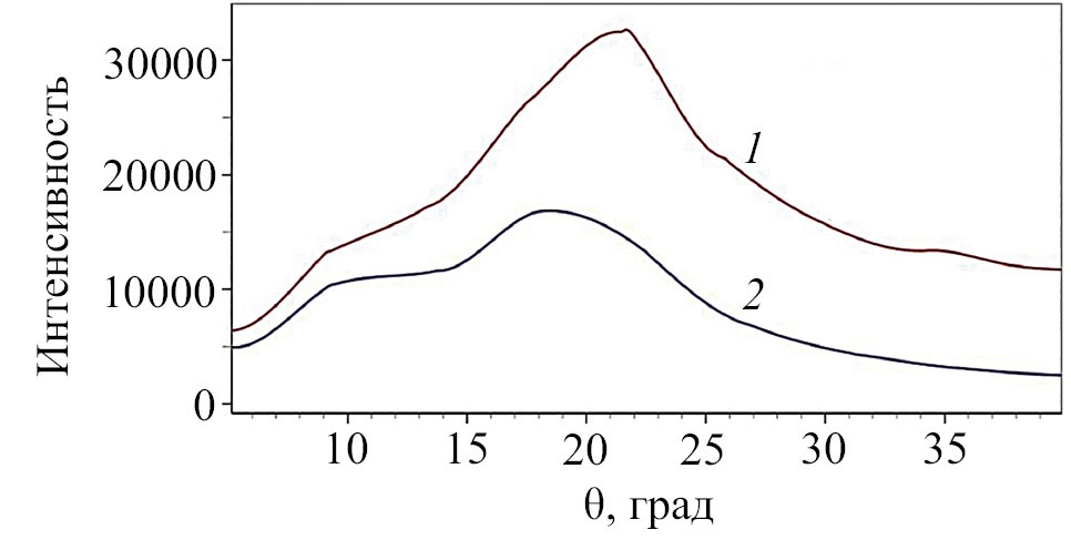 Рис. 8. Рентгеновские дифрактограммы нановолокон целлюлозы (1) и диацетата целлюлозы (2).
