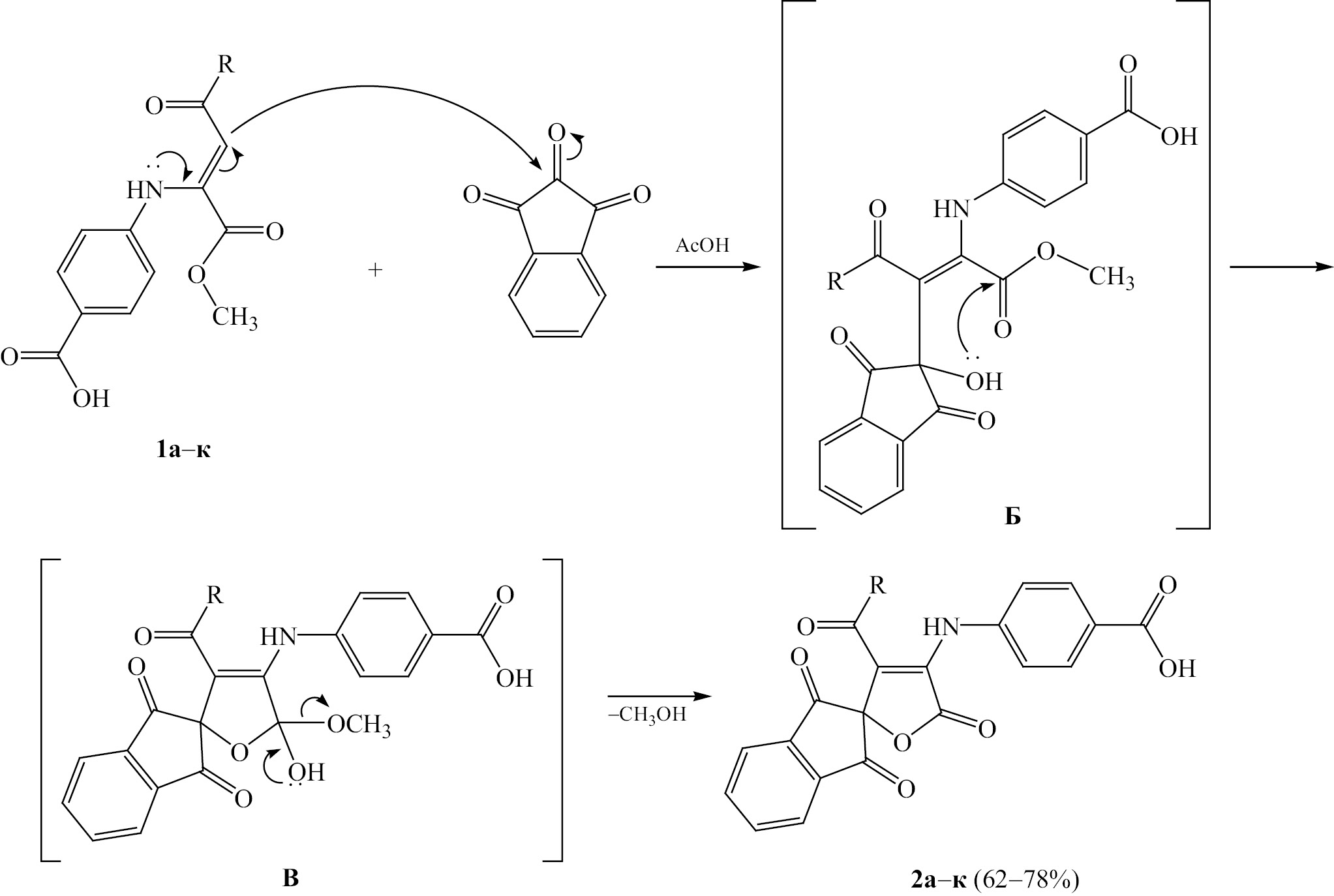 На первой стадии соединения 1a–к присоединяются по двойной связи карбонильной группы нингидрина в положении 2 с образованием промежуточного соединения Б, в котором спиртовая гидроксильная группа у четвертичного углеродного атома остатка нингидрина атакует углеродный атом сложноэфирной карбонильной группы с циклизацией в интермедиат В, из которого выталкивается метанол и формируется лактонная карбонильная группа в соединениях 2a–к.