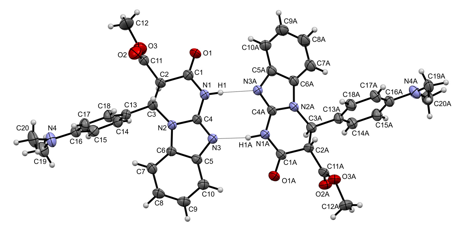 Соединение 2 кристаллизуется в центросимметричной пространственной группе триклинной сингонии в виде сольвата с ацетонитрилом в соотношении 4:1 (рис. 1, молекула растворителя не изображена). Кристаллографически независимая часть элементарной ячейки состоит из молекулы ацетонитрила с заселенностью 0.5 и двух энантиомерных молекул 2 с конфигурацией атомов C2, C2A, C3 и C3A – R, S, S, R соответственно. Независимые молекулы имеют близкую геометрию с транс-расположением арильного и метоксикарбонильного заместителей, находящихся в псевдоэкваториальных позициях. Независимые молекулы связаны попарно в димеры за счет межмолекулярных водородных связей N1–H1∙∙∙N3A и N1A–H1A∙∙∙N3 (рис. 1).
