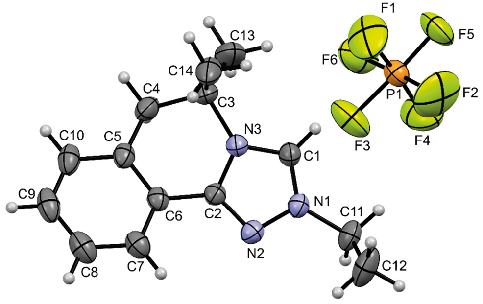 Таким образом, в результате проведенных исследований получен ряд бромидов и гексафторфосфатов 1,2,4-триазоло-5,6-дигидро[3,4-a]изохинолин-2-ия, состав которых подтвержден данными масс-спектрометрии высокого разрешения, а строение данными спектроскопии ЯМР 1Н, 13С и рентгеноструктурного анализа. Полученные соли будут далее использованы в качестве N-гетероциклические карбеновых лигандов в синтезе новых комплексов палладия(II) PEPPSI-типа.