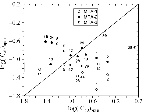 Рис. 5. Зависимость между экспериментальными и прогнозируемыми значениями активности соединений.