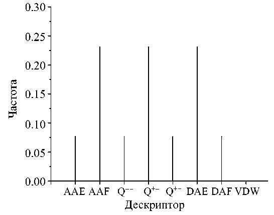 В табл. 2 приведены статистические параметры моделей при использовании стратегии МПА-1. Следует отметить, что не все примененные алгоритмы обеспечивают получение удовлетворительных QSAR моделей. В частности, метод случайного леса показывает худший результат, поэтому он не использовался для межклассового прогноза активности. Для выявления значимости дескрипторов был проведен расчет частоты их появления при проведении МПА-1 (рис. 3). При этом можно отметить, что наиболее часто в качестве независимых переменных в QSAR моделях фигурируют AAF и DAF дескрипторы. Это может свидетельствовать о том, что при использовании стратегии МПА-1 наиболее значимыми внутримолекулярными парными атомными взаимодействиями являются взаимодействия типа Н-акцептор–Н-акцептор и Н-донор–Н-акцептор. Среди AAF дескрипторов наиболее часто встречается дескриптор 143, при этом он изменяется в пределах от 0.000 до 0.122. Минимальное и максимальное значение наиболее значимого DAF дескриптора 634 составляет 0.000 и 0.674 соответственно.