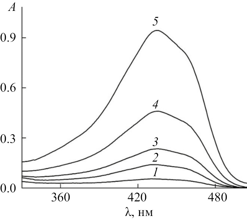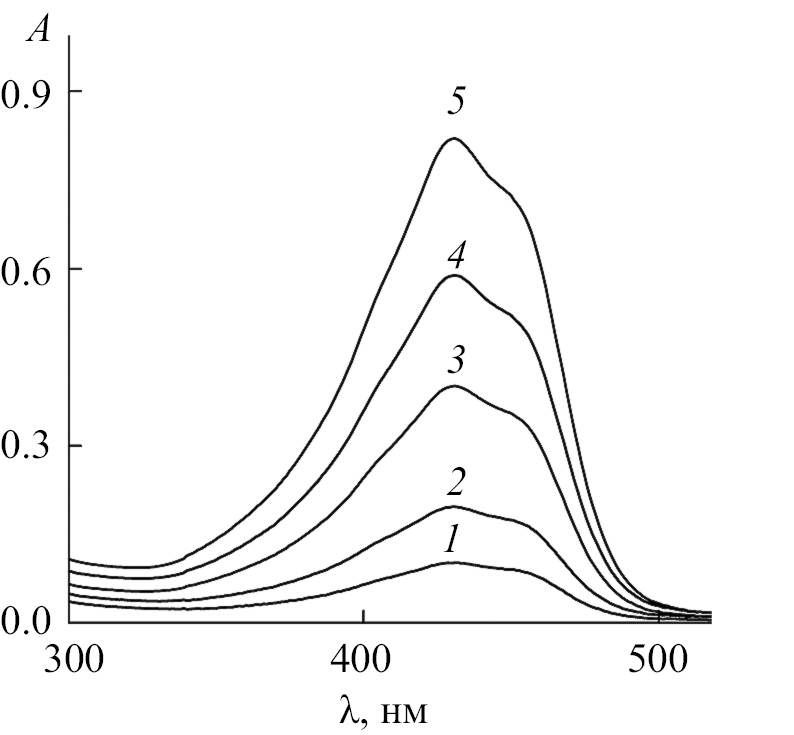 Рис. 1. Спектры поглощения куркумина в растворах ДМСО при длине оптического пути (l) 1 см и концентрациях препарата с2 = 1.5 (1), 3.6 (2), 5.5 (3), 10.6 (4) и 19.3 мкМ (5).
