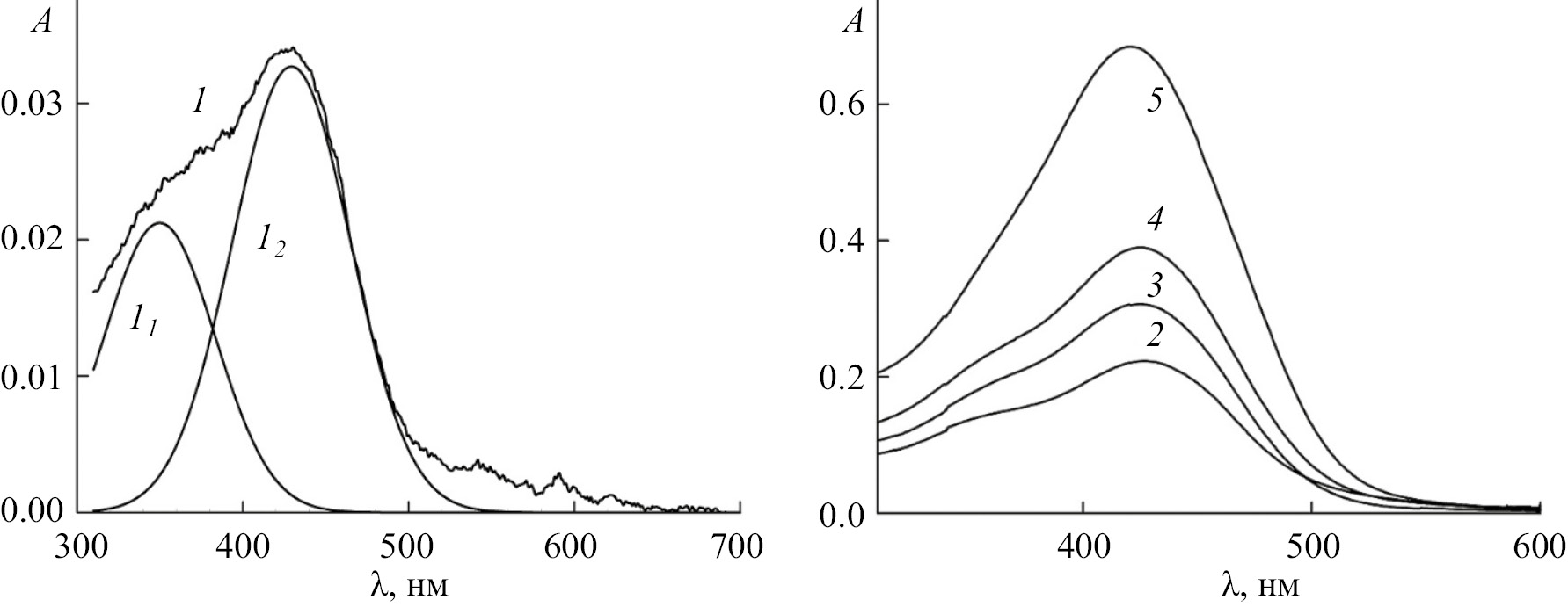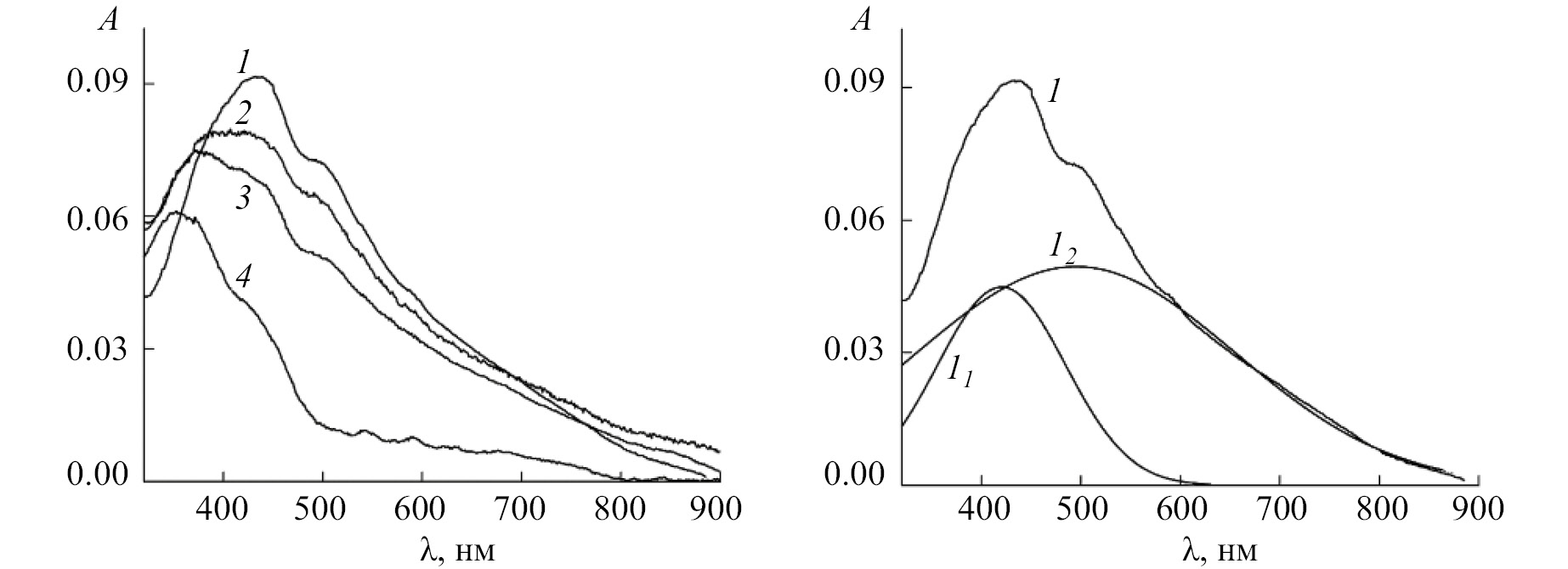 Со временем наблюдается не только снижение оптической плотности (А), но и изменение формы спектров куркумина. Так, через 7 сут в спектре красителя (кривая 2) вместо максимума просматривается площадка с постоянным значением А в диапазоне 370–433 нм. В спектре, измеренном через 9 сут (кривая 3), вновь наблюдается максимум А, но уже при λ = 373 нм, а в области 433 нм – только плечо. Спустя 21 сут положение максимума смещается в сторону более коротких длин волн (353 нм), а плечо в области 435 нм становится слабо выраженным (кривая 4). Наблюдаемые изменения в спектрах куркумина, происходящие в течение 21 сут, свидетельствуют о нестабильности водной системы красителя, проявляемой согласно работам [9, 10, 13, 16], как в виде снижения оптической плотности, так и в существенном изменении формы его спектров из-за разрушения молекул красителя [9, 10, 13, 16].