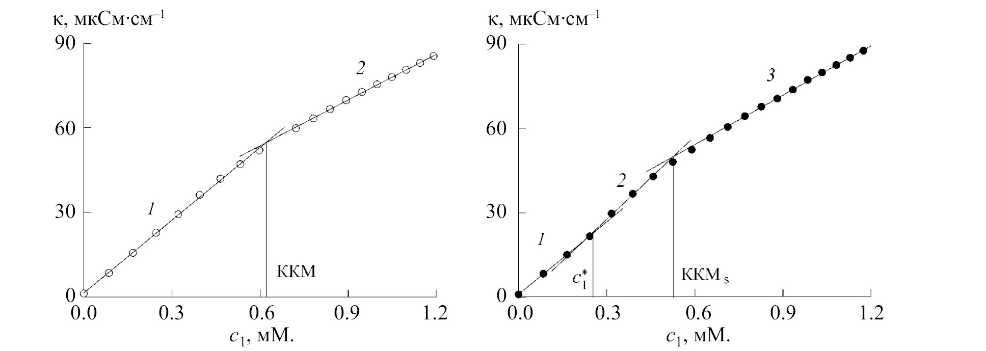 Совместное решение уравнений (9) и (10) относительно с1 приводит к значениям с1* = 0.305 мМ., уравнений (10) и (11) – ККМs = 0.56 мМ., которые близки к полученным методом кондуктометрии: с1* = 0.28 мМ., ККМs = 0.52 мМ.