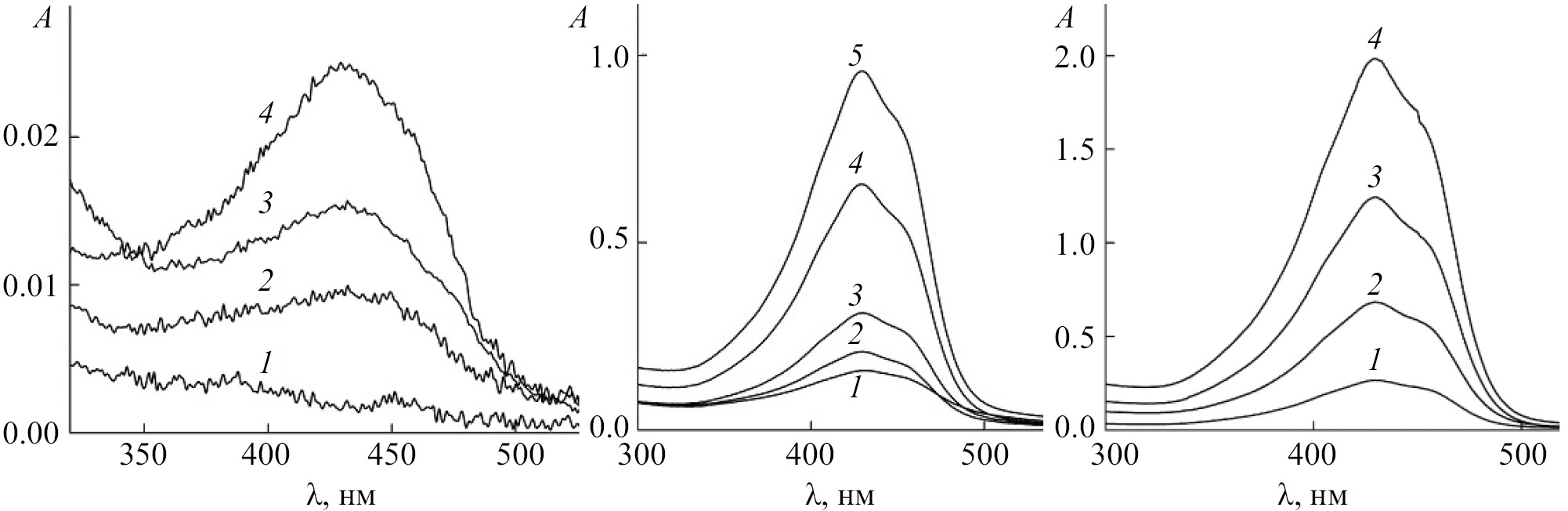 7. Fig. 5. Absorption spectra of aqueous saturated solution of curcumin in the presence of TDPPB at concentrations of c1, mM: (a) 0. 1 (1), 0.18 (2), 0.25 (3) and 0.29 (4); (b) 0.36 (1), 0.4 (2), 0.44 (3), 0.5 (4) and 0.6 (5) at l = 1 cm; (c) 0.75 (1), 0.96 (2), 1.3 (3) and 1.9 (4) at l = 0.2 cm.