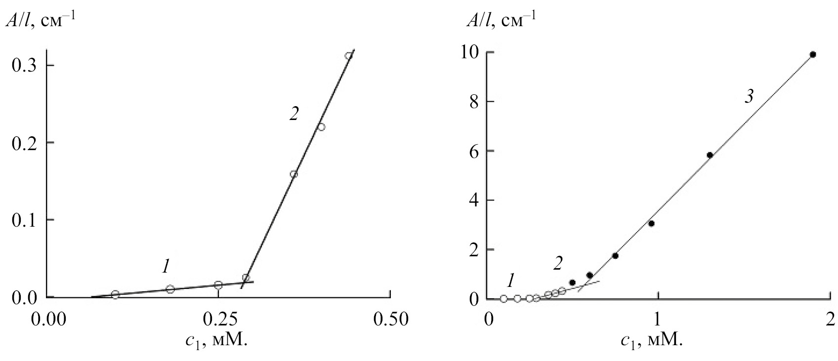 Концентрацию перехода к протомицеллам, обеспечивающую заметное повышение оптической плотности при 430 нм (с1*), можно найти как координату точки пересечения линий 1 и 2 на рис. 6а, а концентрацию самоагрегации ТДТФФБ в присутствии солюбилизата (ККМs) – как координату точки пересечения линий 2 и 3 на рис. 6б. Прямые 1, 2 и 3 характеризуются уравнениями (9), (10) и (11) соответственно: