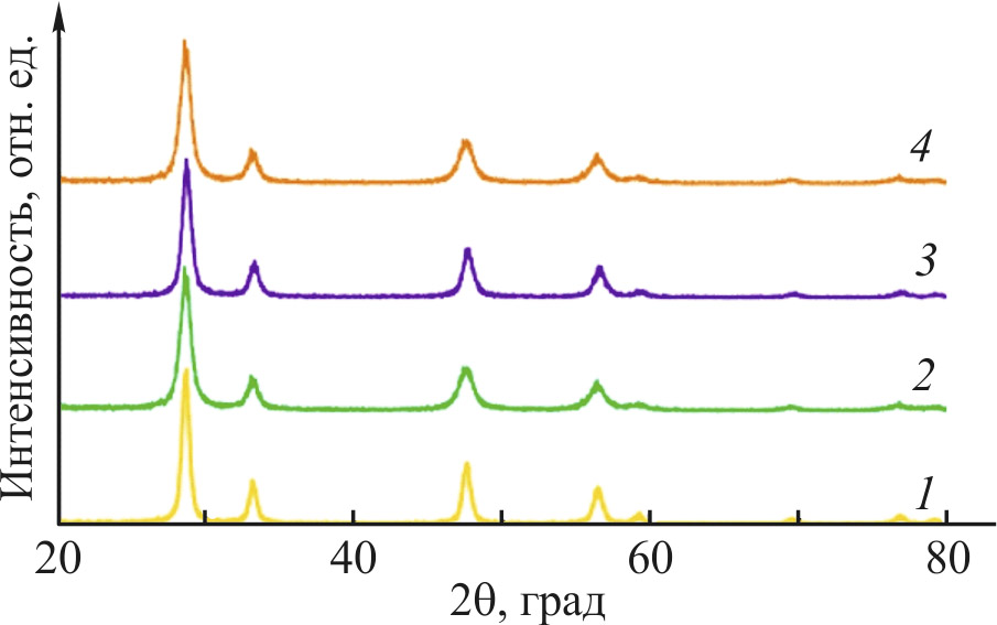 1 — CeO2, 2 — Ce0.85Zr0.10La0.05O2–δ, 3 — Ce0.85Zr0.10Nd0.05O2–δ, 4 — Ce0.85Zr0.10Gd0.05O2–δ.