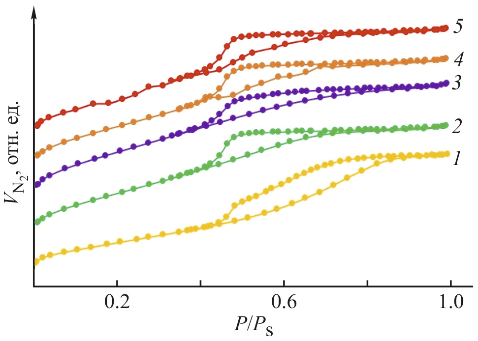 Текстурные характеристики образцов исследовали методом низкотемпературной адсорбции азота на анализаторе NOVA 1200e (Quantachrome). Активацию образцов проводили при температуре 200°С в течение 4 ч. Удельную поверхность (SУД) материалов рассчитывали по уравнению Брунауэра–Эммета–Теллера, суммарный объем пор (VΣ) определяли при относительном давлении P/Ps 0.99, распределение пор по размерам — по уравнению Баррета–Джойнера–Халенды с использованием программного обеспечения анализатора.