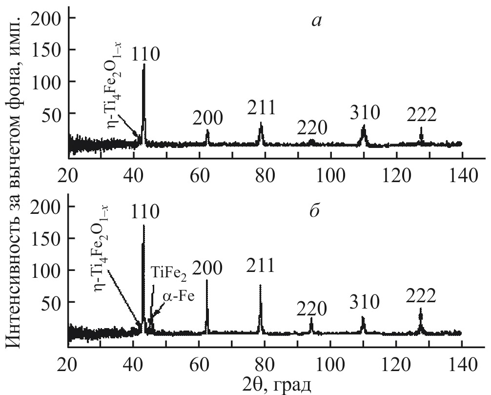 Все дальнейшие опыты по поиску оптимальных условий гидрирования сплава TiFe* заключались в изменении температуры дегазации и гидрирования, давления водорода, продолжительности синтеза и количества катализирующей добавки, проводились по методике, приведенной для образца 1 (табл. 1), кроме образцов 6–8 (табл. 1), не подвергавшихся циклированию при различных температурах, и заканчивались при снятии давления образованием твердого раствора водорода в TiFe. На дифрактограммах продуктов (типичный пример приведен на рис. 1, а) образование такой фазы проявляется в снижении интенсивности и уширении соответствующих пиков, относящихся к интерметаллиду TiFe. При этом пики примесей и даже слабые пики основной фазы (например, 220 и 222) становятся сравнимыми с шумом, что затрудняет проведение количественного анализа по рентгеновским данным. Результаты профильного анализа дифрактограмм TiFe* и образца 2 (табл. 1; рис. 1) приведены в табл. 2.