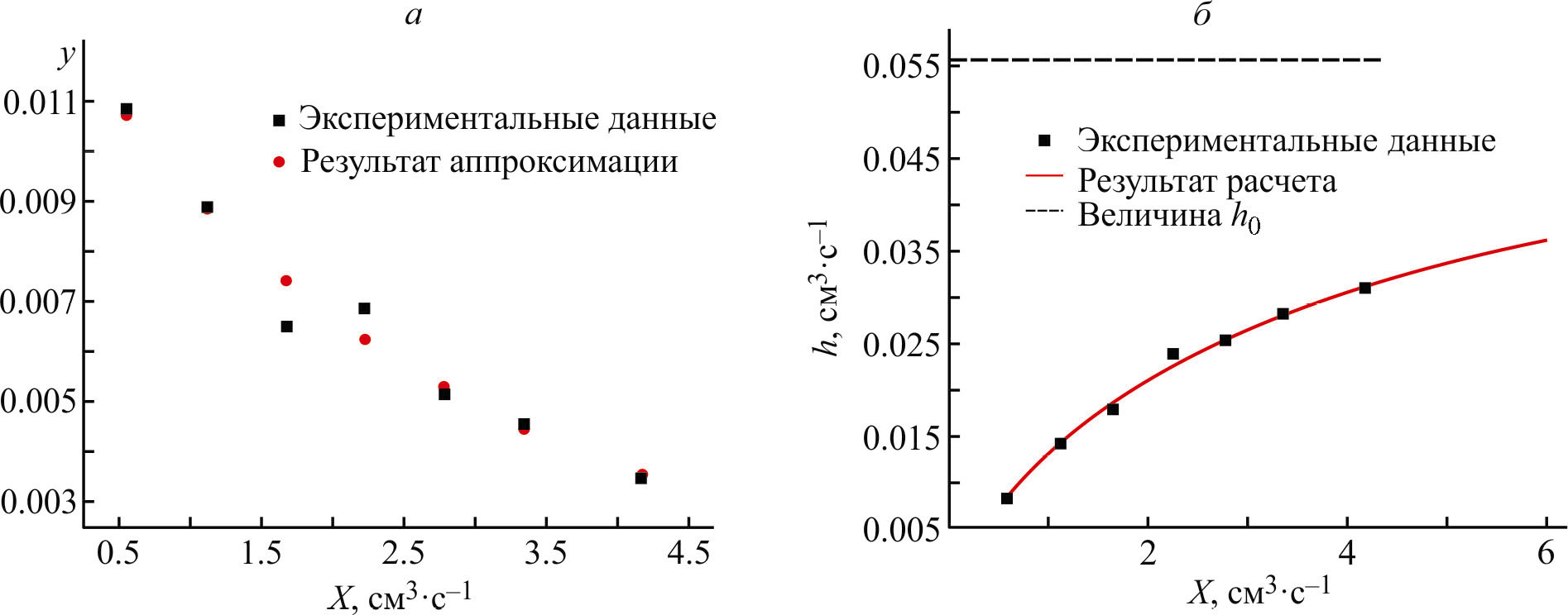 По результатам аппроксимации а = 0.000039. Параметр h0, рассчитанный из зависимости, приведенной на рис. 2, а, составляет 0.167·10–3 см3·с–1. Из экспериментальной зависимости y(Х) рассчитана зависимость h(Х) (рис. 2, б). Величина h не зависит от X и близка к h0 (две выпавшие из общей закономерности экспериментальные точки отклоняются от значения h0 не более чем на 10%). Это означает, что за короткое время действия импульса количество образующегося водорода мало, и эффективность его генерации существенно не снижается. Следовательно, выбранное приближение корректно.
