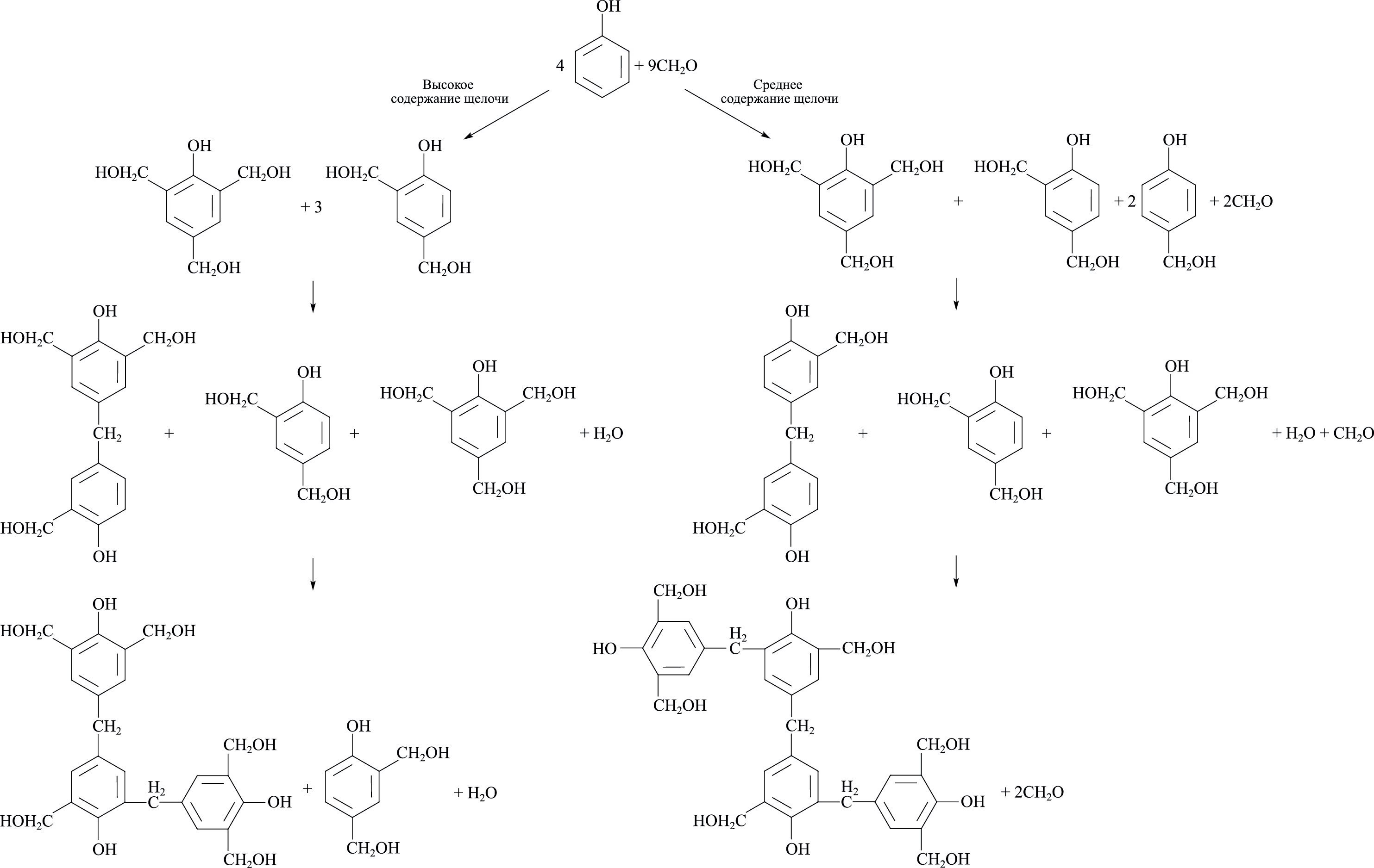 В случае взаимодействия 4 молекул фенола с 9 молекулами формальдегида при мольном соотношении фенол:NaOH = 1:0.73 и 1:0.61 (реакционная смесь с высоким содержанием NaOH) после образования фенолоспиртов и их поликонденсации образуются олигомеры, содержащие 3 остатка фенола и по одной метиленовой связи орто–параʹ и пара–параʹ; четвертая молекула фенола превращается в 2,4-диметилолфенол. В случае взаимодействия 4 молекул фенола с 10 молекулами формальдегида десятая молекула формальдегида может присоединиться к свободному реакционному центру ароматического кольца фенолоспирта.
