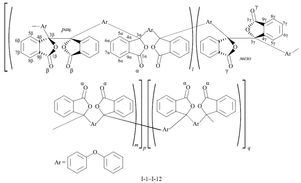 В основной цепи сополиариленфталидов содержатся дифениленоксидные фрагменты, чередующиеся либо только с одиночными (α) фталидными группами (в q-звеньях), либо с одиночными и двумя смежными фталидными (дифталидными) группами рацемической (β) и мезо- (γ) конфигураций (в p-звеньях). Полимеры I-1–I-12 различаются соотношением p- и q-звеньев, которое определяется мольным соотношением 3,3ʹ-бис(4-феноксифенил)-3,3ʹ-дифталида и дифенилоксида в исходной мономерной смеси (табл. 1). Содержание типов звеньев в полимерных цепях определяли, сравнивая в спектрах ЯМР 13С интенсивности сигналов атомов углерода С3α (~91.0 м. д.), С3β (~90.5 м. д.) и С3γ (~90.0 м. д.).
