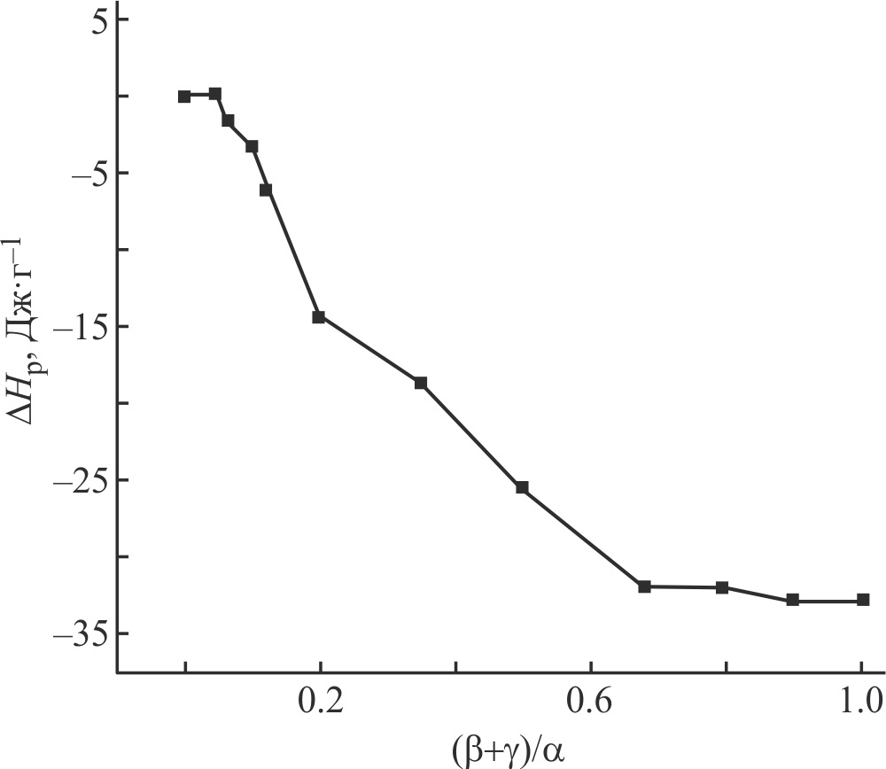 Рис. 2. Зависимость энтальпии деструкции (ΔHр) сополиариленфталидов при 350°С от соотношения смежных [рацемических (β) и мезо- (γ)] и одиночных (α) фталидных групп.