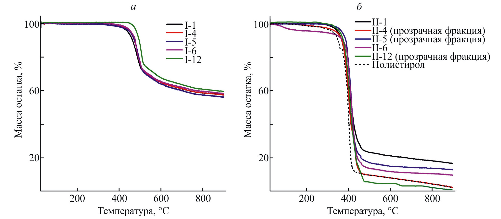 Рис. 4. Кривые термогравиметрического анализа сополиариленфталидов I (а) и их сополимеров со стиролом II (б).