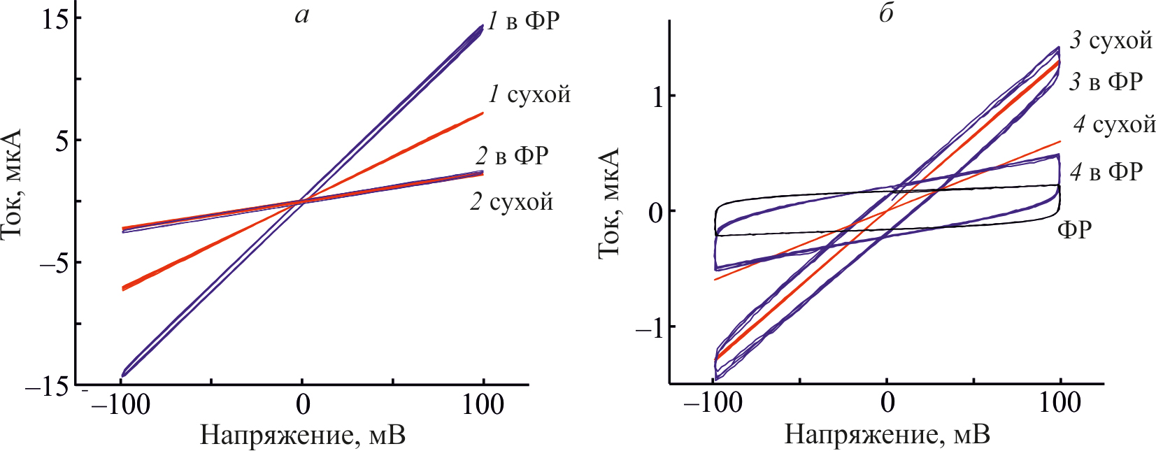 При исследовании образцов пленок в физиологическом растворе (рис. 1) проявляются те же факторы изменения электропроводности, что и при исследовании пленок в сухом состоянии. Важно отметить, что в случае композиций с графеном термолизованных полиимидов электронная проводимость материалов становится сопоставимой с ионной проводимостью ячейки (рис. 1, б, кривые 3, 4). По этой причине линейные вольт-амперные зависимости преобразуются в циклические вольт-амперограммы, характерные для ион-проводящего физиологического раствора (рис. 1, б).