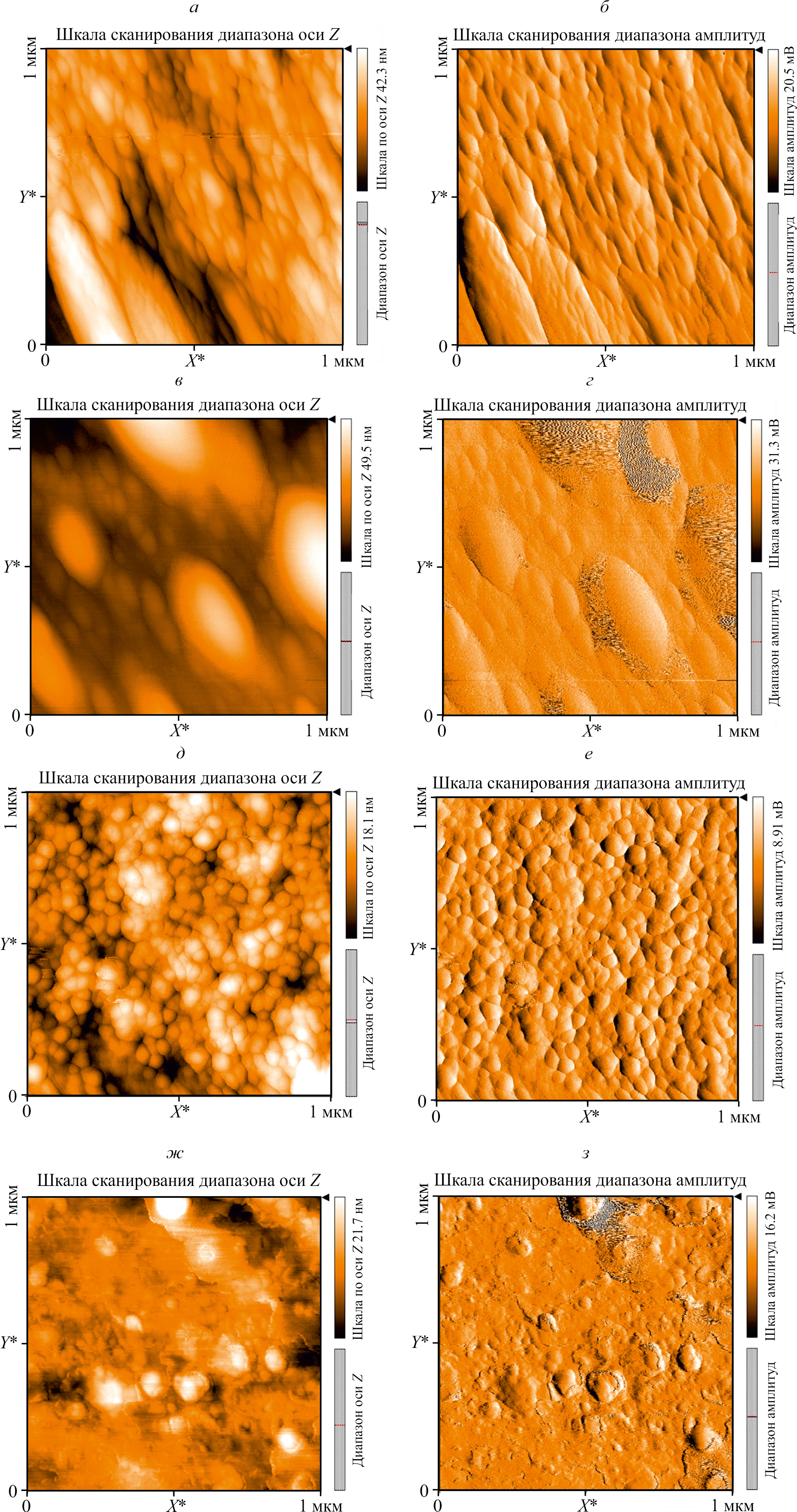 В режиме топографии (а) сополи(уретан-имид)-170°C, (в) сополи(уретан-имид)-170°C + 1 мас% графена, (д) сополи(уретан-имид)-300°C, (ж) сополи(уретан-имид)-300°C + 1 мас% графена; в режиме амплитуды (б) сополи(уретан-имид)-170°C, (г) сополи(уретан-имид)-170°C + 1 мас% графена, (е) сополи(уретан-имид)-300°C, (ж) сополи(уретан-имид)-300°C + + 1 мас% графена; площадь сканирования 1 × 1 мкм.