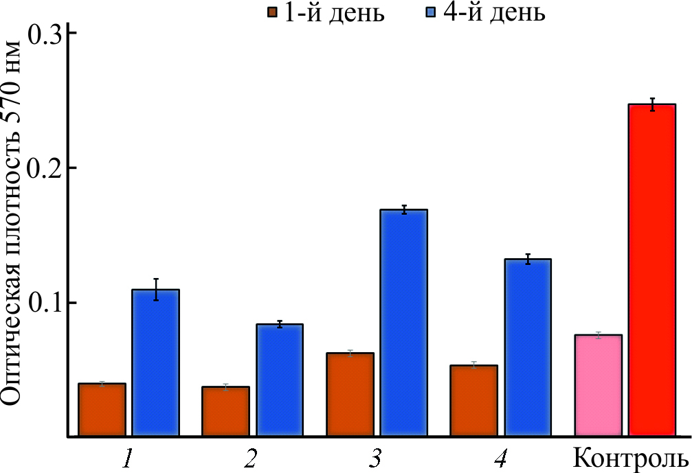 Рис. 4. Диаграмма метилтетразолиевых тестов по результатам культивирования дермальных фибробластов человека в течение 1 (левый столбец каждого образца) и 4 сут (правый столбец каждого образца) на поверхностях субстратов.