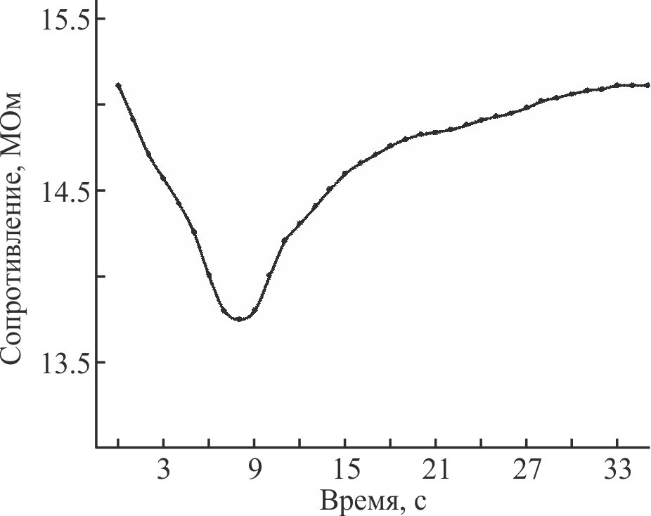 Ряд образцов характеризуется резким падением сопротивления при небольших концентрациях аммиака (5–50 мг·м–3) и отсутствием изменения сопротивления при более высоких его концентрациях, что может быть связано как с достижением фазового равновесия процесса адсорбции газа на поверхности пленки, так и с достижением химического равновесия процесса комплексообразования. Следует отметить, что максимальное падение электрического сопротивления происходит при концентрациях аммиака, близких к предельно-допустимой концентрации аммиака в воздухе рабочей зоны.3 Сопротивление пленочных образцов достигало первоначальных значений в течение не более 10–12 с (рис. 3) по мере уменьшения концентрации аммиака вплоть до нуля. Сопротивление пленочных образцов на основе индивидуальных полисахаридов (9–12 ГОм) в отсутствие наночастиц иодида серебра оставалось неизменным и не изменялось в присутствии аммиака в воздухе.