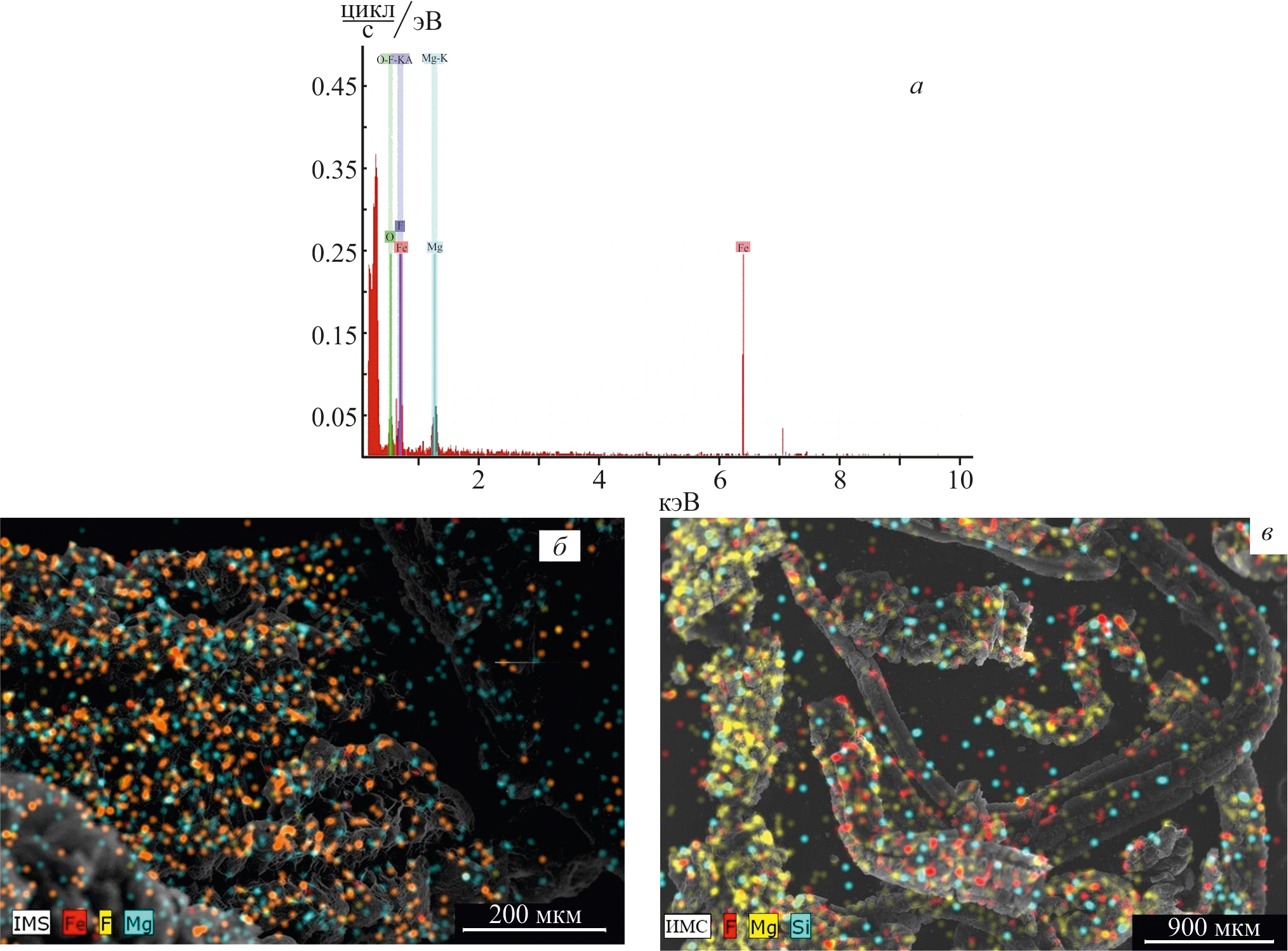 Рис. 3. Рентгенофлоуресцентный спектр и карты элементного состава для образцов терморасширенного графита, модифицированных Fe2O3 (а, б) и SiO2 (в).