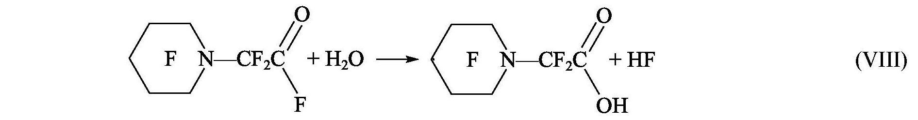 Электрохимическое фторирование хлорида N-этанолпиридиния (VI) и бромида метилового эфира N-пиридинуксусной кислоты позволяет получить фторангидрид перфтор-N-пиперидинуксусной кислоты (VII) — прозрачную жидкость с резким запахом, которая легко гидролизуется на воздухе до перфтор-N-пиперидинуксусной кислоты. Для удобства хранения и идентификации методом ЯМР 19F данный фторангидрид был переведен в метиловый эфир перфтор-N-пиперидинуксусной кислоты посредством метанолиза. Часть сырца была переведена в перфтор-N-пиперидинуксусную кислоту посредством гидролиза (VIII).